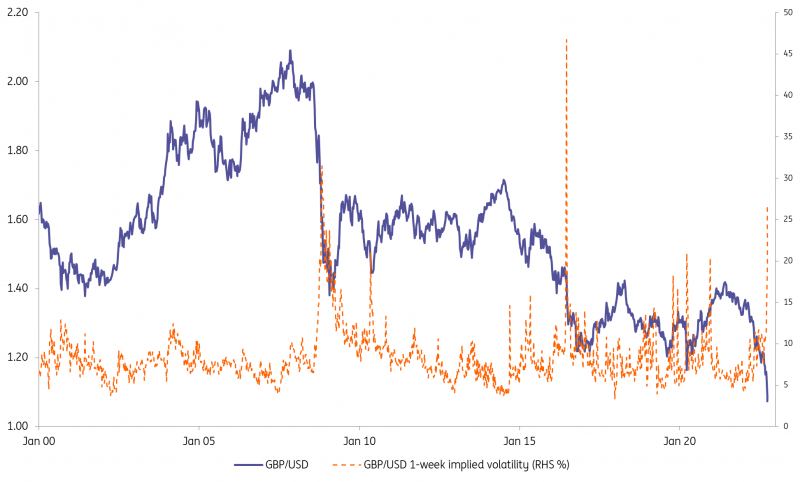 然而,一夜之间亚洲市场下跌3.5%,英镑/美元一周波动率达到28%(接近2020年3月的高点),这无疑标誌著交易的“无序”。无序的市场通常会促使政策制定者做出反应。