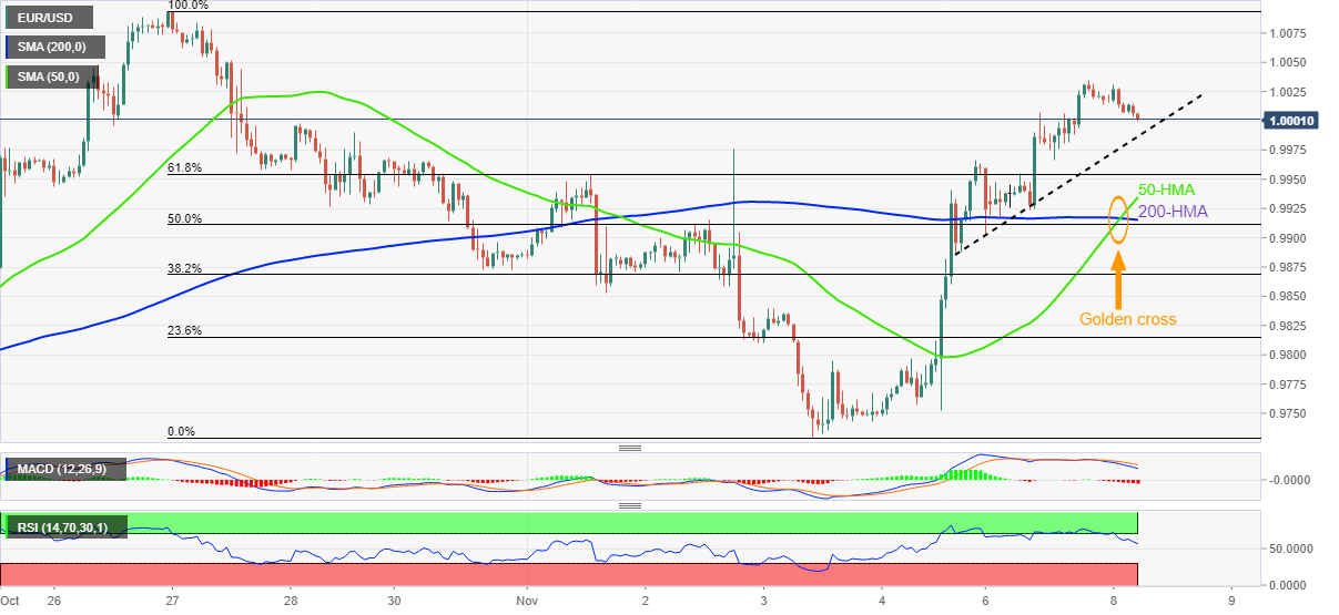 之后,汇价10月26日至11月3日期间跌势的61.8%斐波回档位接近0.9955,将挑𢧐欧元空头。