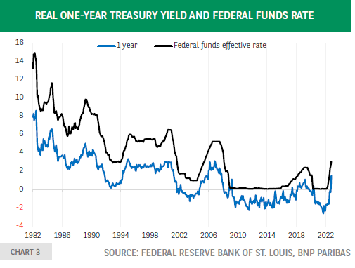 美联储会在什麽水平停止提高联邦基金利率?这个问题对美国经济的活动和需求以及金融市场都极為重要。在最近的新闻发布会上,美联储主席杰罗姆·鲍威尔对联邦公𫔭市场委员会的反应功能含糊其词,但他确实提到了他们将关注实际利率。这就提出了一个问题,用哪种通胀指标来从名义利率转向实际利率?一个可能的解决方案是使用克利夫兰联邦储备银行(Federal Reserve Bank of Cleveland)计算的通胀预期期限结构。侭管最近大幅上涨,但除2018年外,一年期实际国债收益率仍低于前几次紧缩周期期间达到的水平。在通胀上升的背景下,紧缩周期显然不会结束。侭管美国1年期国债的实际收益率最近大幅上升,但仍低于此前紧缩周期期间达到的水平。美联储的工作还没有结束。