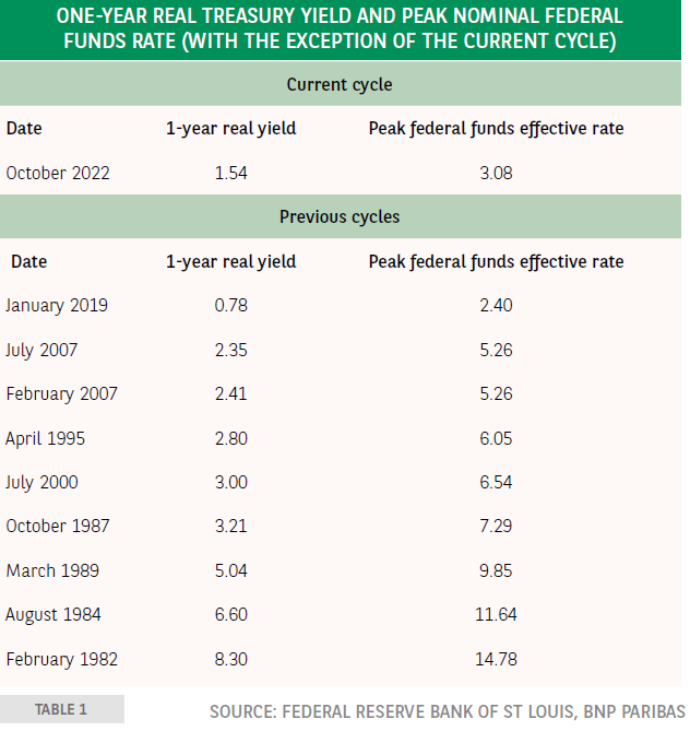 图1显示了自2021年初以来期限结构的演变。通胀预期全面上升,但在2021年基本上是平行上升,而今年,短期预期的增长远远超过长期预期。重要的是,政策收紧已导致短期预期在9月份达到峰值后大幅下降。然而,从历史角度来看,一年期预期通胀仍处于上世纪90年代初以来区间的高端(图2)。因此,侭管近期大幅上升,但除了2018年以外,一年期实际国债收益率仍低于前几次紧缩周期期间达到的水平(图3和表2)。