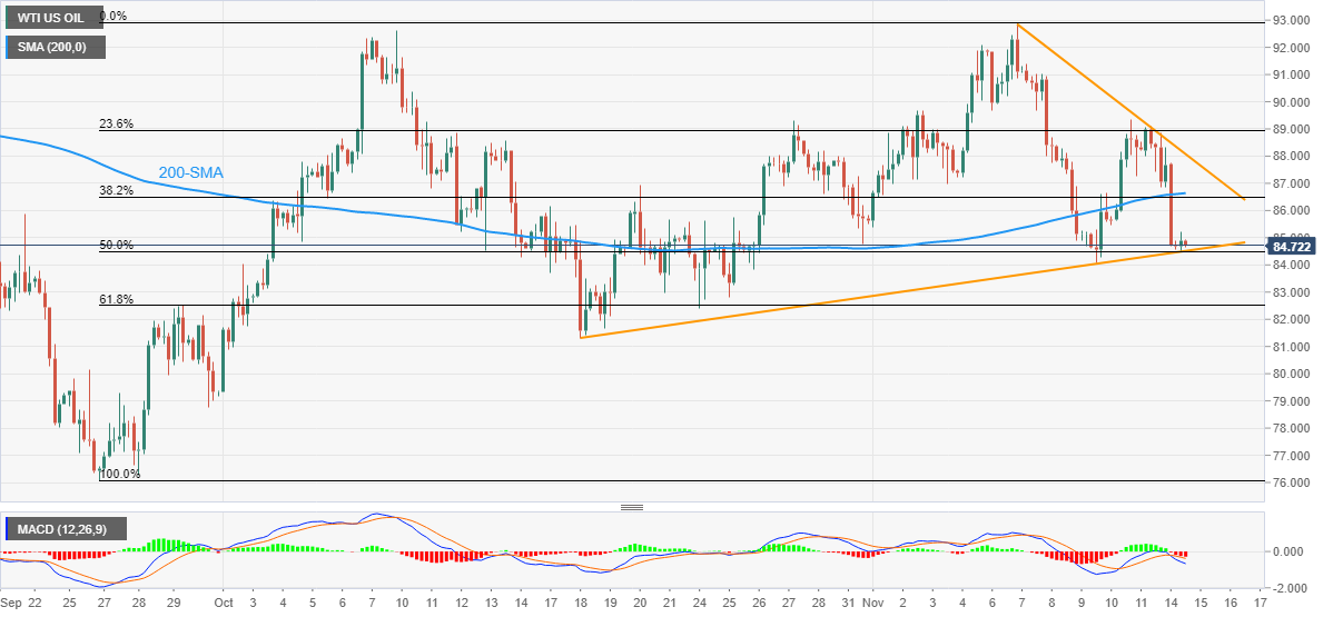 油价试探了84.50美元的支撑汇合处,包括一个月前的上升趋势缐和该商品9-11月期间波段的50%斐波回档位。