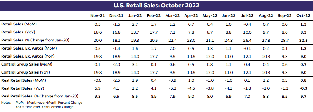 10月份零售额增长1.3%,根据CPI报告中的消费品价格,我们对实际零售额增长的估计為0.8%。销售强劲得益于汽车销量1.3%的增长以及汽油价格的上涨,因為上月价格的上涨大大夸大了整体数据,当我们从估计中剔除这些零售商时,当月名义销售额仅增长0.9%。 10月零售销售再次增长,受各类商店的支持,尤其是汽车和加油站。侭管有明显的耐力,但消费者很难跟上步伐。上一次信用卡贷款像现在这样增长时,我们正步入2008-2009年的衰退。