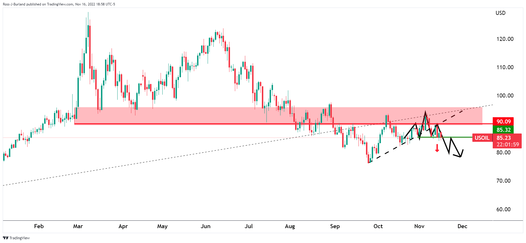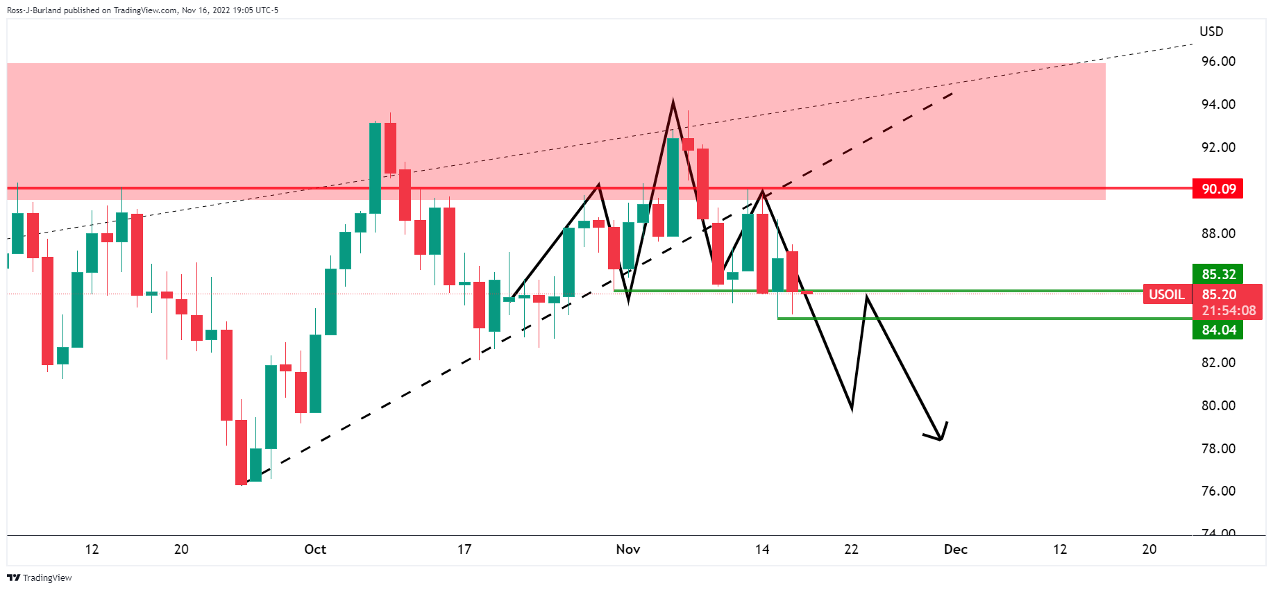 如图所示,WTI油价确实符合周四笔者预期的走势。空头目前可能在前期看涨趋势的起点介入,指向更低的目标: