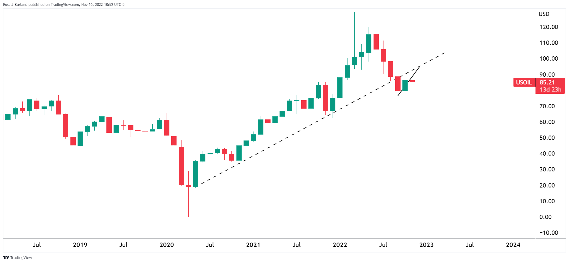 WTI油价处在月缐趋势背面,再度测试趋势时受到阻力: