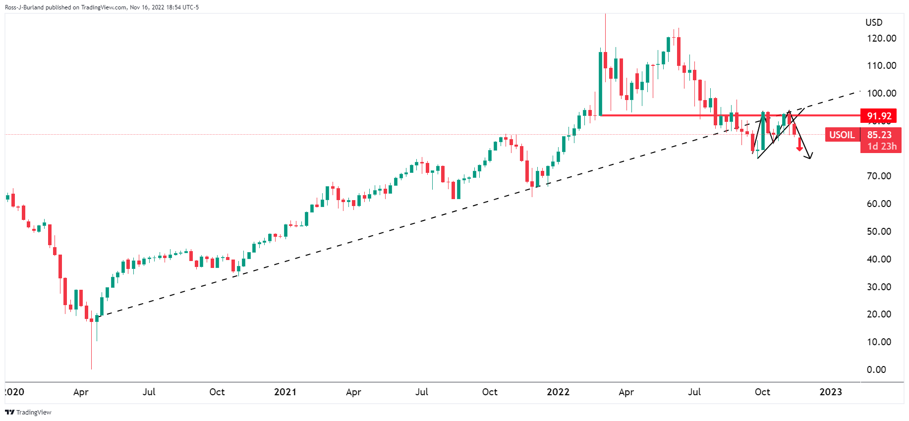 日缐图显示WTI油价处在看跌头肩形态,这一形态处在小型趋势缐的背面: