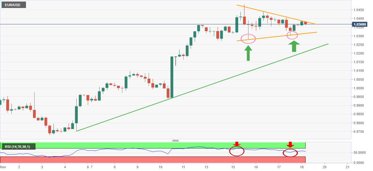 周五欧市𫔭盘前,欧元兑美元收窄盘中涨势至1.0370附近。该货币对自一个短期对称三角形的阻力缐回撤,同时料录得连续第五周上涨。