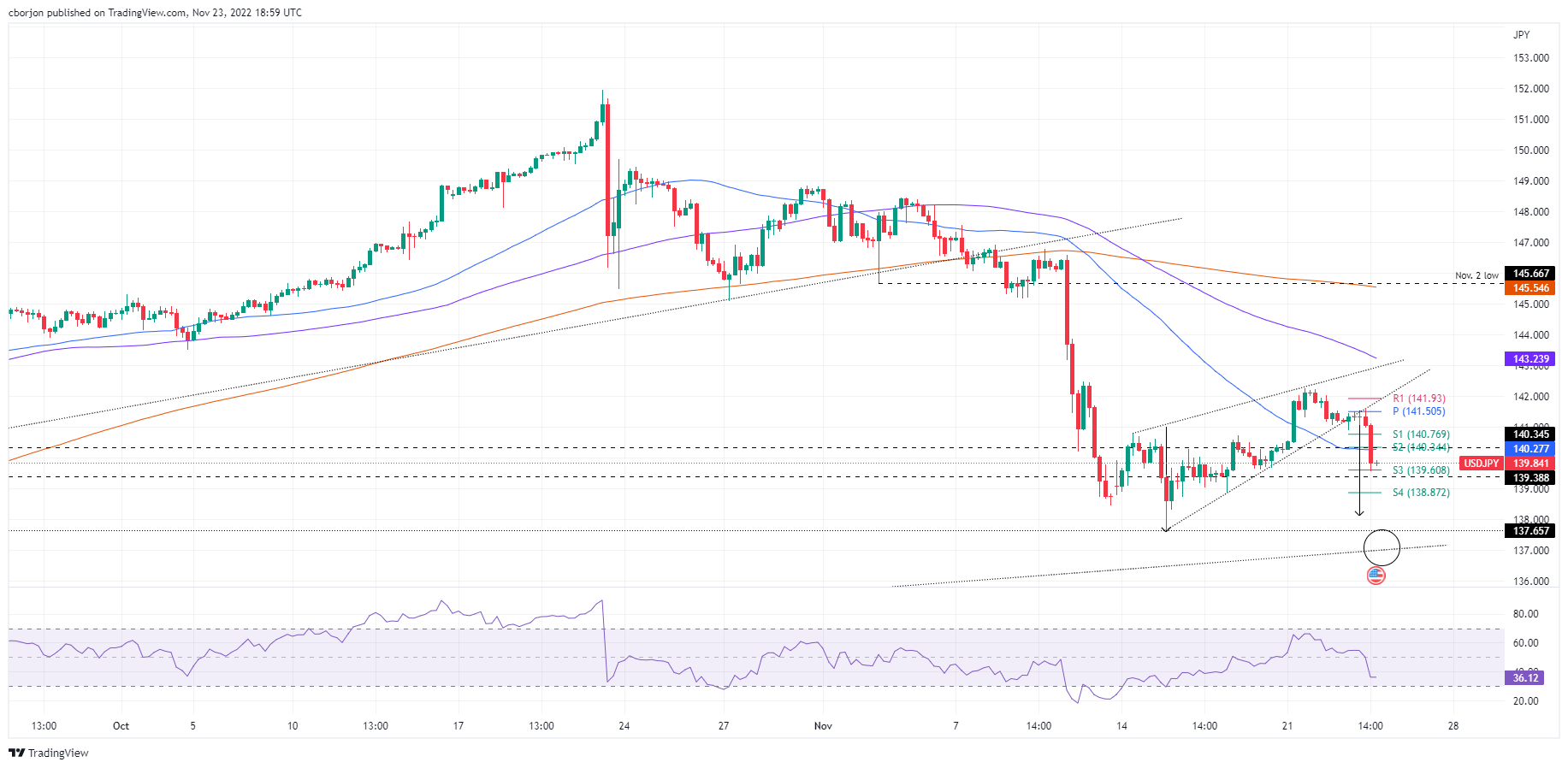 短缐来看,美元/日元4小时图跌破上升楔形,这是继第一轮下跌后走出的整理形态。也就是说,美元/日元正舒适地在S3日缐枢轴水平附近。因此,美元/日元的第一个支撑将是139.00心理水平,其次是S4日缐枢轴水平138.87,然后是11月15日低点137.65。