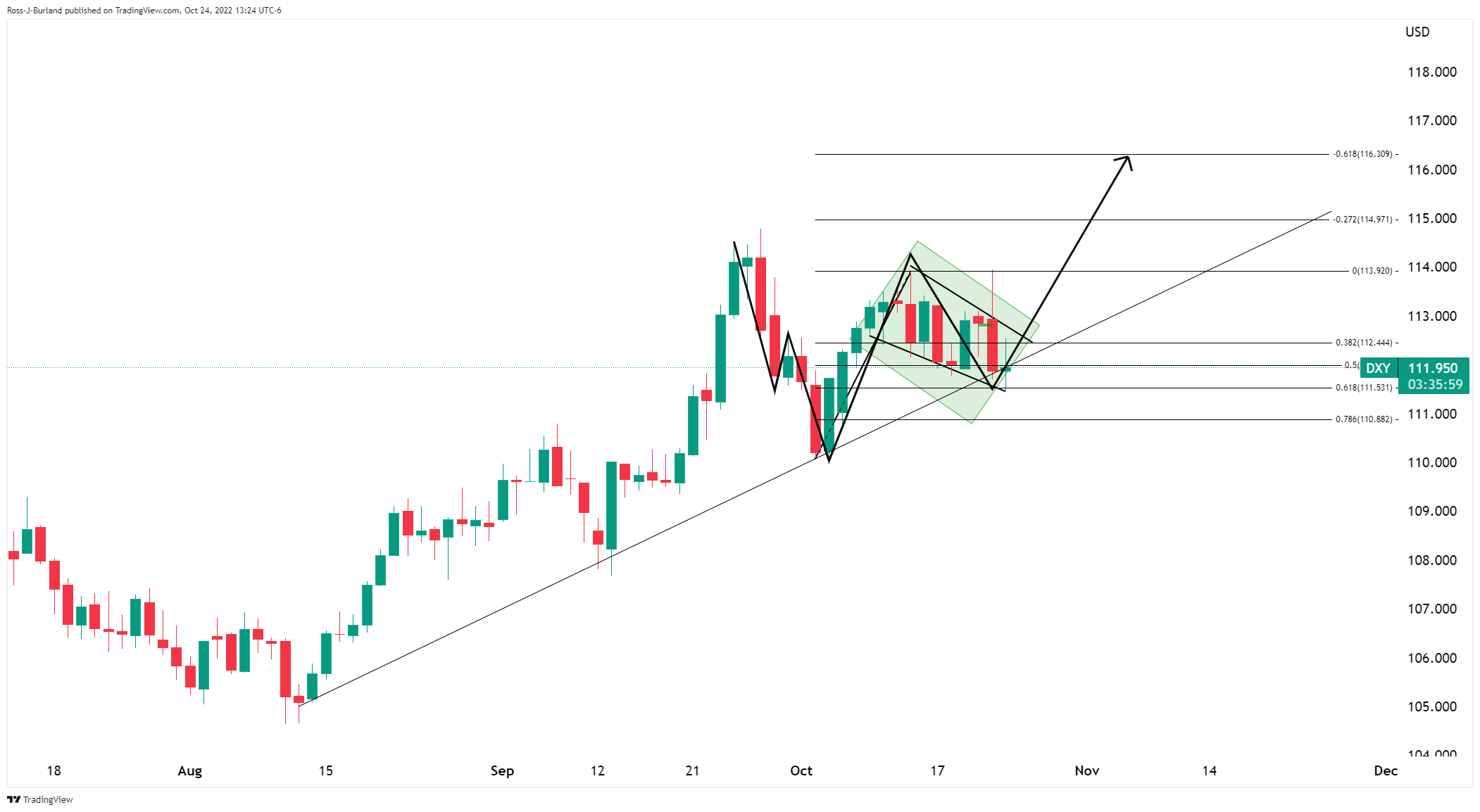 日图显示,美元处在关键支撑水平附近,处在看涨旗形内。支撑位不断上升,美元将重获生机,并阻止金价走出更强劲回调的前景。