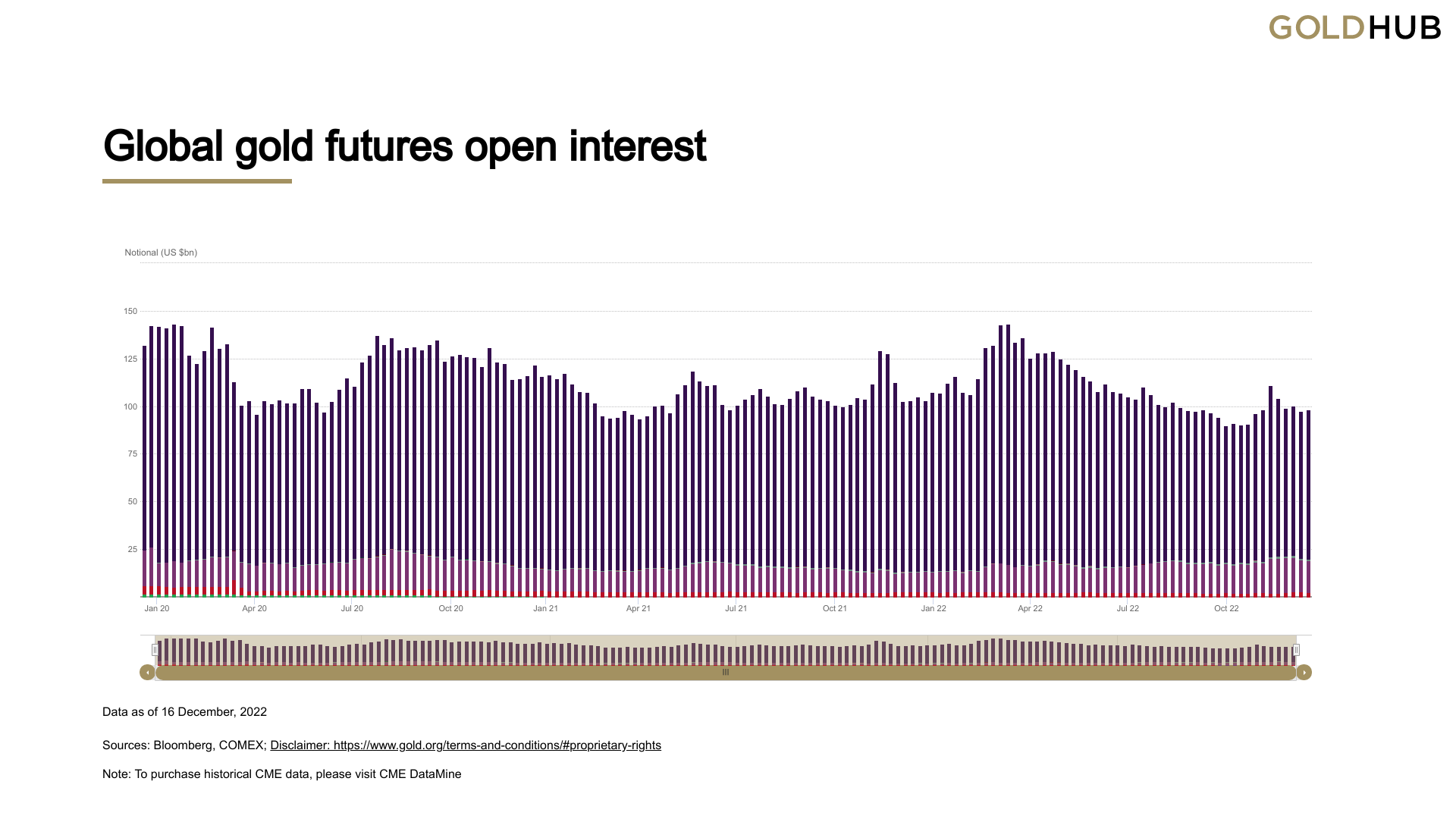 黄金期货交易所的未平仓合约数量从3月初(黄金/美元攀升至2,000美元以上)到10月底(黄金/美元在1600美元附近触及数年低点)期间稳步下降。然而,自11月初以来,未平仓合约略有增加。