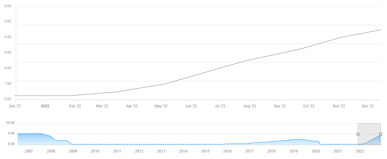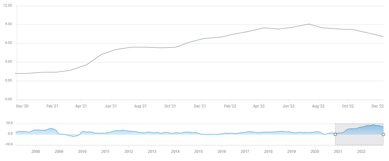 截至12月19日,CME集团的美联储观察工具显示,市场定价美联储在2月和3月选择加息25个基点的概率為52.4%。如果这种情况发生,政策利率将达到4.75-5%,略低于点阵图中的终端利率预测。在12月的会后新闻发布会上发言时,FOMC主席杰罗姆-鲍威尔承认,如果通胀数据继续走软,峰值利率可能会回落。鲍威尔指出,他们预计住房通胀将在2023年回落,但补充说,非住房服务部门的通胀,从根本上说与劳动力市场和工资有关,仍然处于令人不安的高位。最后,鲍威尔澄清说,他们没有考虑在2023年下调政策利率,并重申没有一个决策者在经济展望总结(SEP)中规定了明年的降息。
