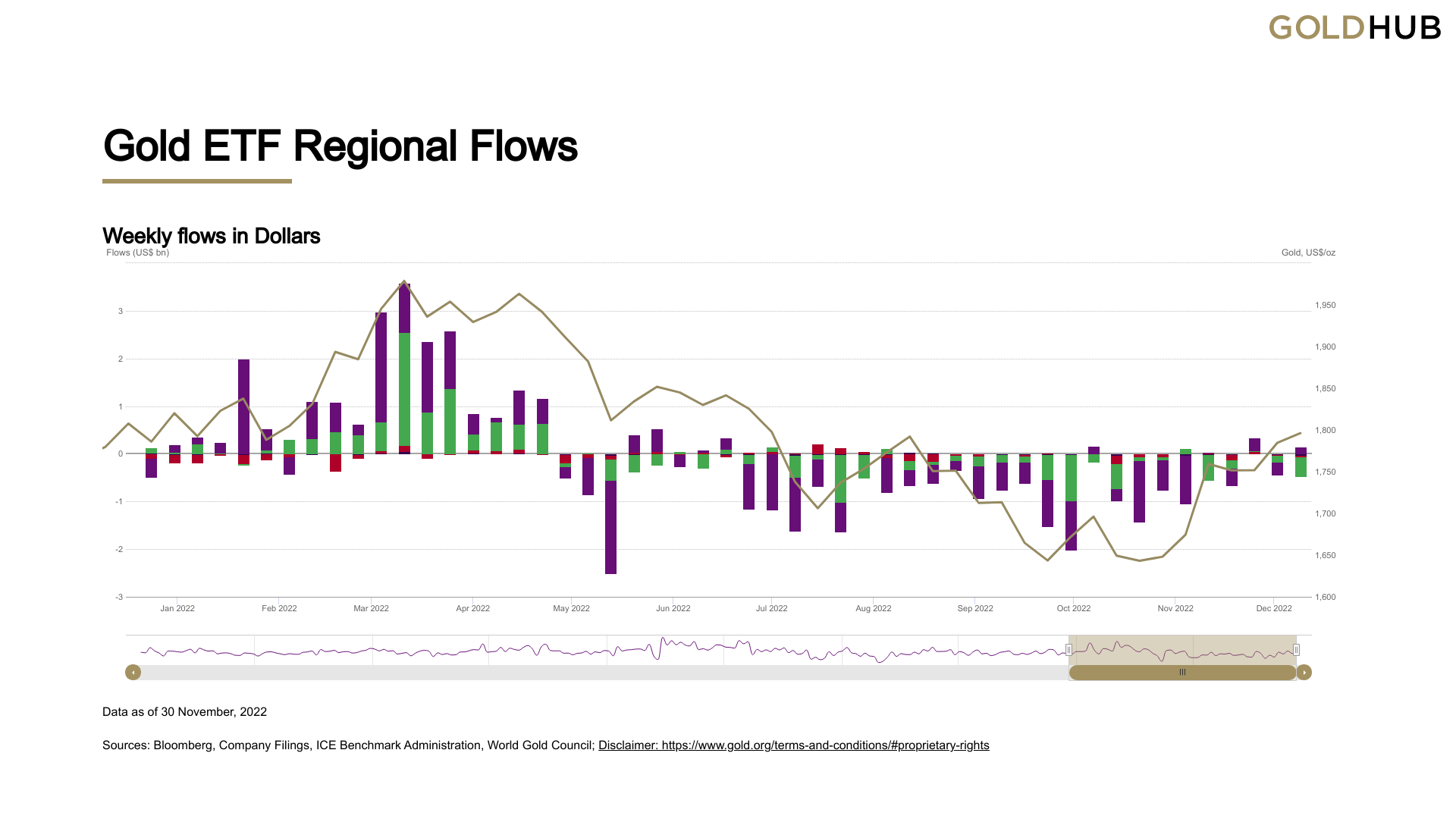 下图代表了从年初到11月底以美元计算、完全由实物黄金支持黄金ETF的流量变化。虽然这个图表还没有指向看涨的倾向,但自10月初以来,总的流出量一直在稳步下降。一旦每周有持续的资金流入,这可以被看作是ETF预期价格将继续上涨的迹象。