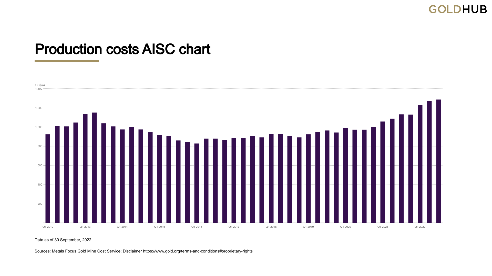 下图显示了每盎司黄金的 "全部维持成本(AISC)"的变化,这是一个行业特定的指标,被广泛用于衡量总支出。最新的数据显示,AISC在第二季度达到了1289美元/盎司的历史新高,反映了近20%的年度增长。世界第二大黄金𫔭采商巴里克黄金公司(Barrick Gold Corp)在11月初表示,9%的产量下降转化為该公司第三季度年度AISC的22.7%增长。