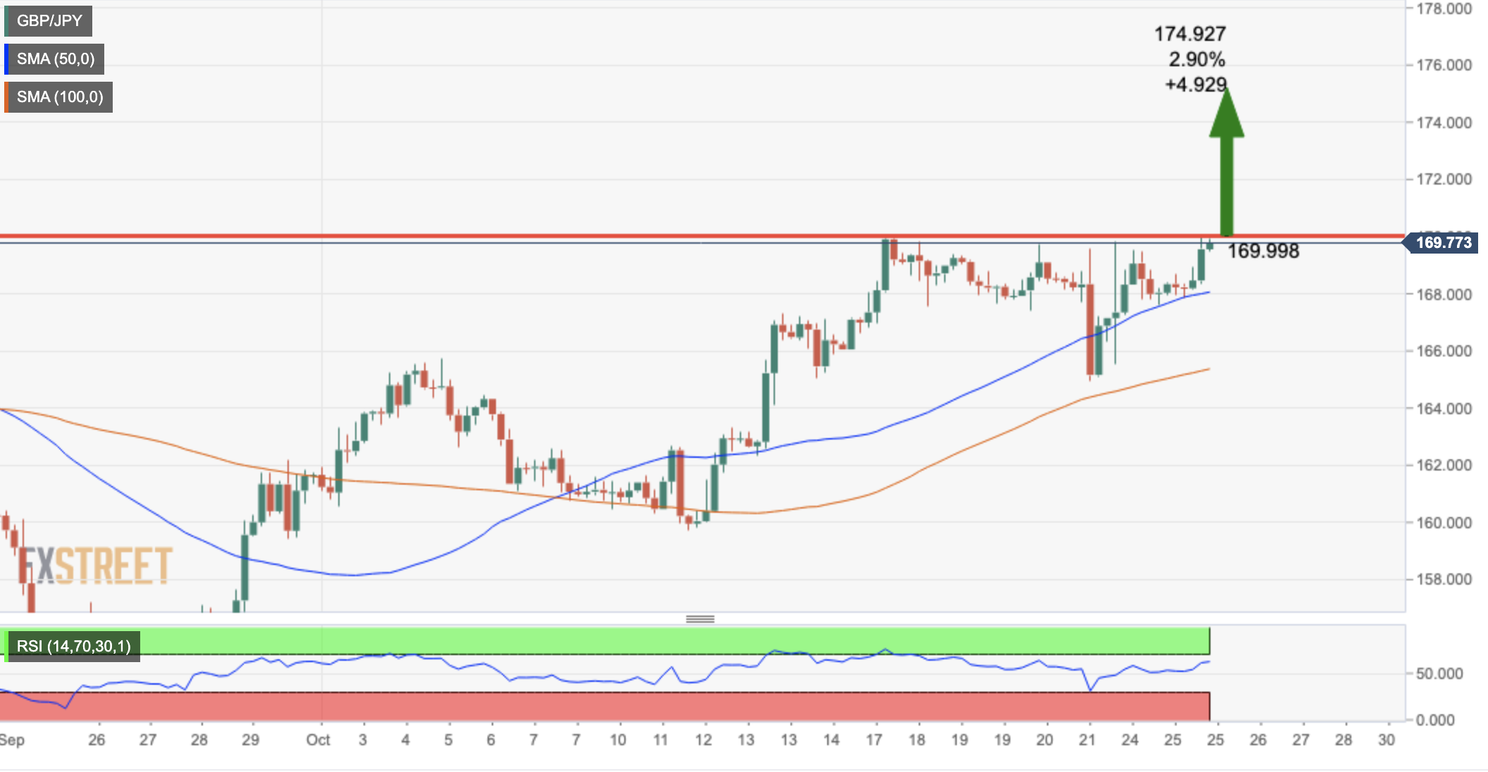 技术指标显示英镑/日元上涨,4小时图显示英镑/日元处在50SMA和100SMA上方。然而,相对强弱指标正接近超𧹒区间,似乎表明多头可能会暂停。