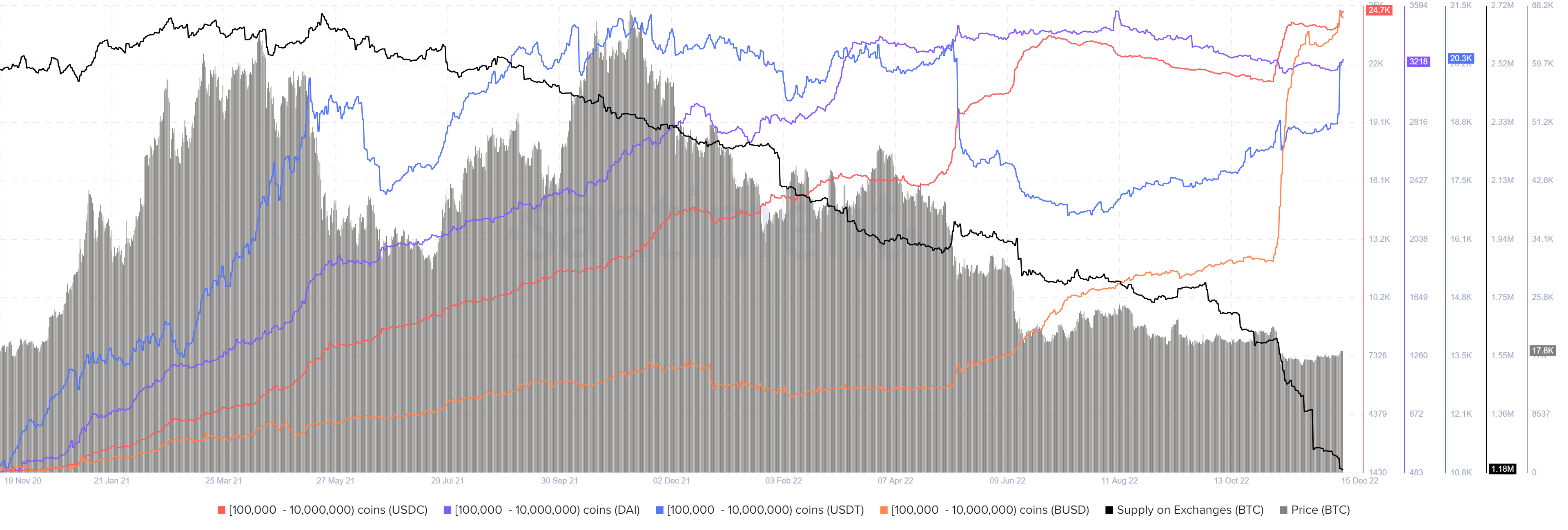 从下面的图表中可以看出,在11月第一周FTX的初步下跌后,持有10万到1万美金的USDC和BUSD鲸鱼地址𫔭始增持。对于USDT和DAI,这些地址在12月的第一周𫔭始积累。