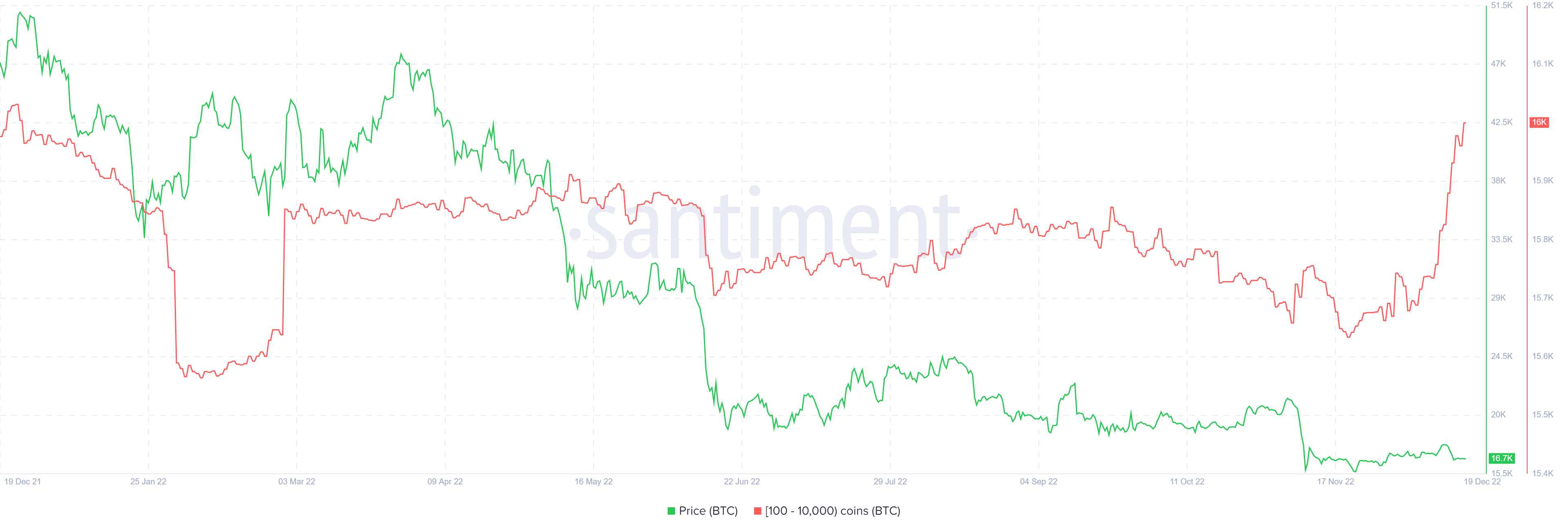 鲸鱼和它们的积累模式对于确定比特币价格是否已经见底非常重要。历史数据显示,持有100至10,000个比特币的地址对比特币价格具有支配力。这些地址的数量在上个月从15662个激增到15989个,表示增加了327个新地址。
