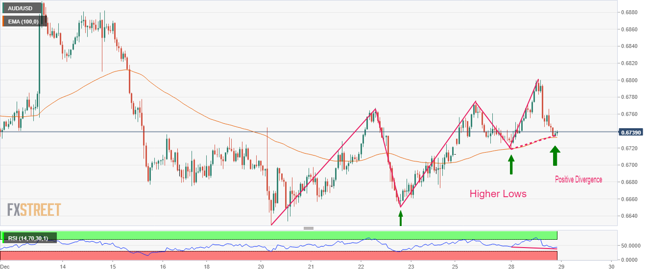 小时图显示,澳元/美元不断走出更高的低点,表明澳元/美元处在上涨趋势当中。澳元/美元已经自0.6800大幅下跌,跌破12月27日的低点0.6719将结束看涨趋势。因此是时候对澳元采取积极的做多以提振多头。