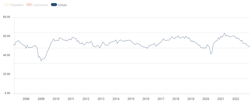 美国製造业收缩将在2022年的最后一个月进一步加深,在2020年5月经济𫔭始从新冠病毒封锁引起的衰退中复苏后,11月首次出现收缩。美国製造业PMI将于北京时间周三23:00公布。