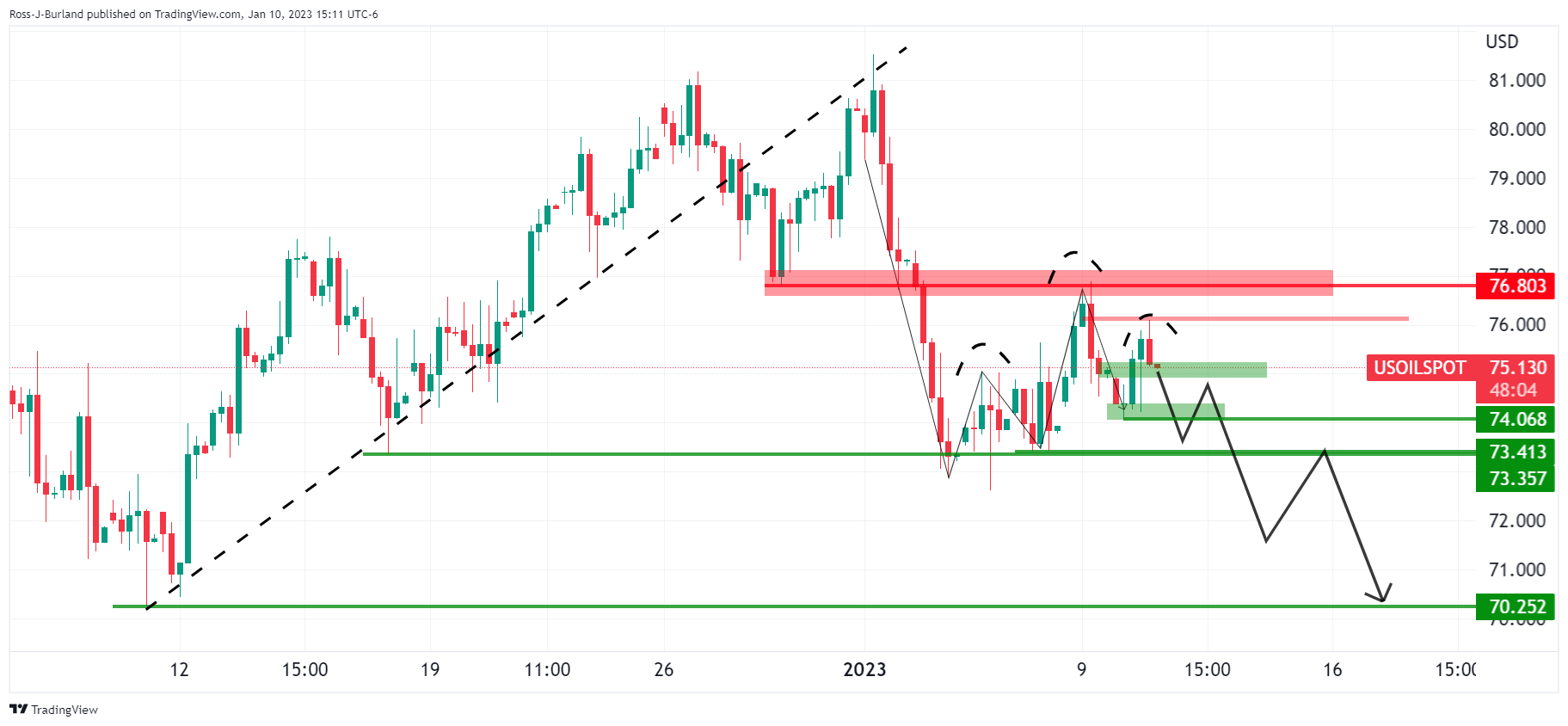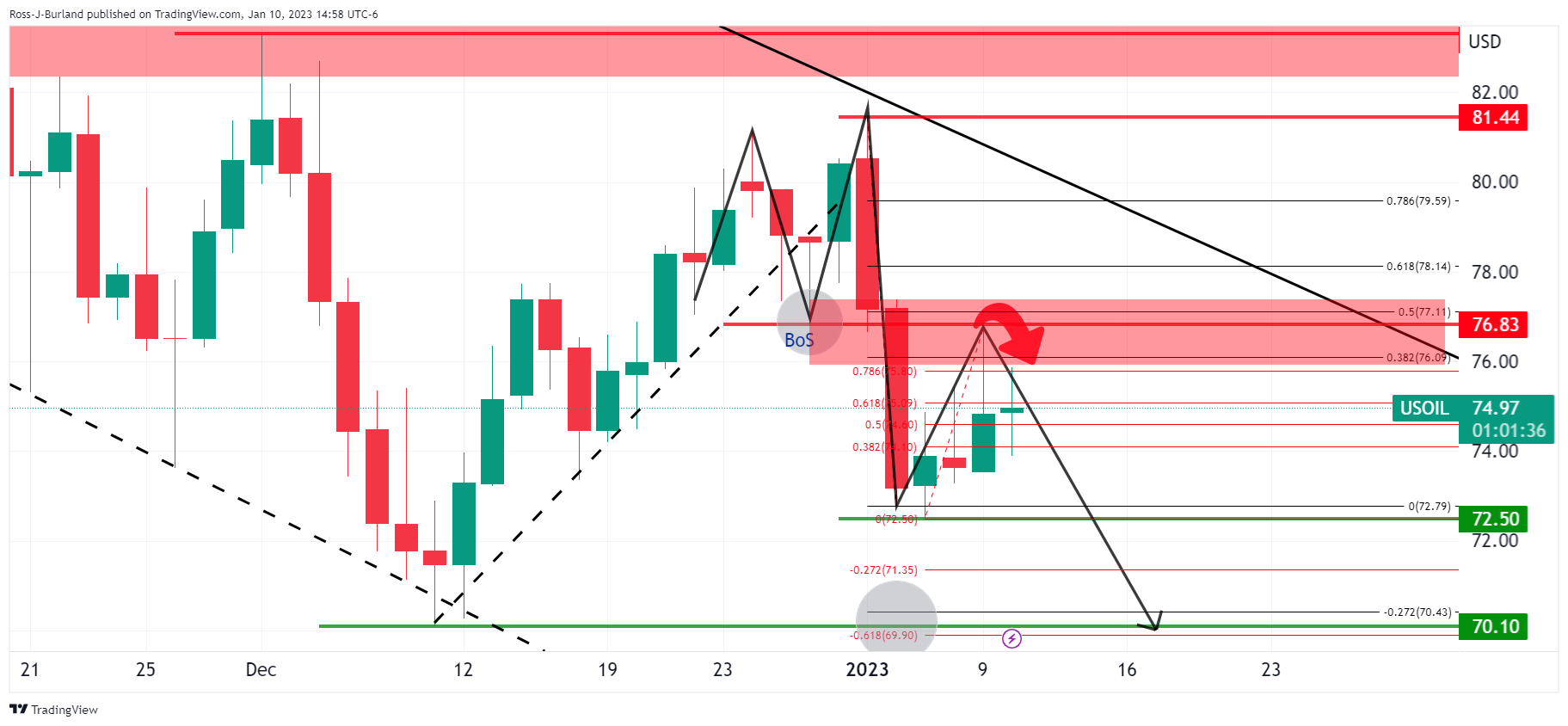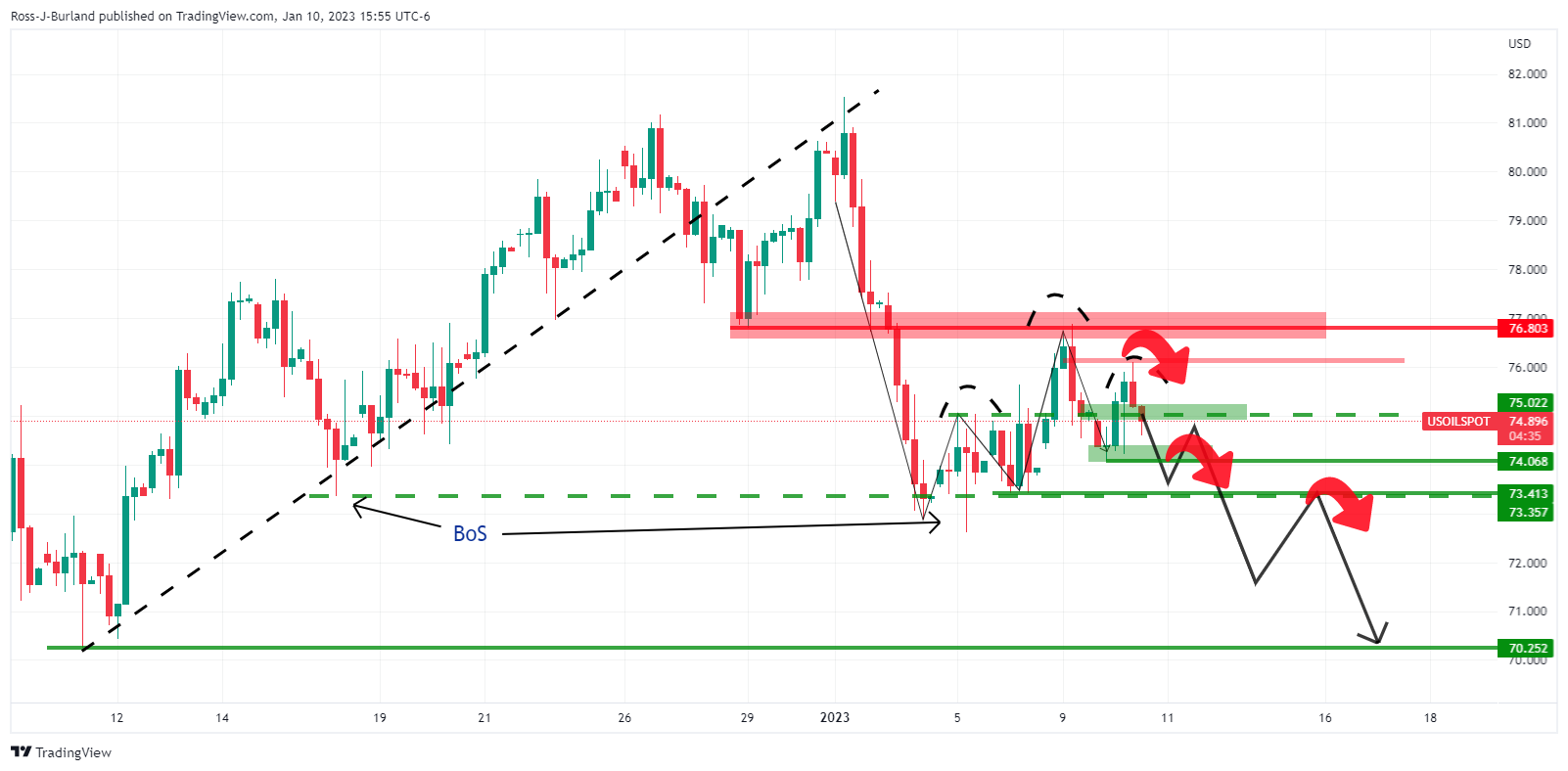 4小时走势图显示WTI油价构筑头肩形态,由于WTI油价跌破肩底,WTI油价倾向于下跌,指向70美元。 The 4-hour chart offers a head and shoulders scenario and given we have already seen a break of structure, BoS, then this gives kudos to the downside bias fore the foreseeable future with $70.00 eyed.