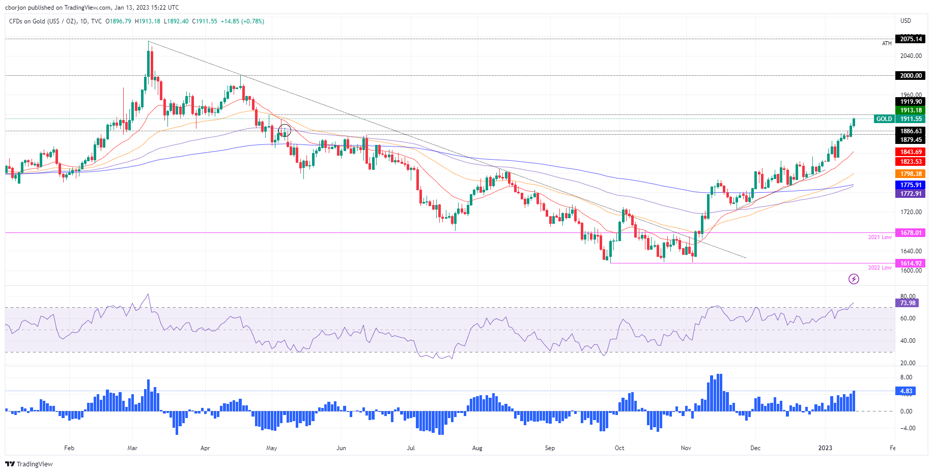 周五,黄金价格创下9个月新高,达到1913.18美元,因投资者猜测美联储在公布疲软的通胀数据后可能会转向不那麽激进的立场。因此,黄金/美元连续第四周上涨,日内目前上涨0.82%,报1912美元。
