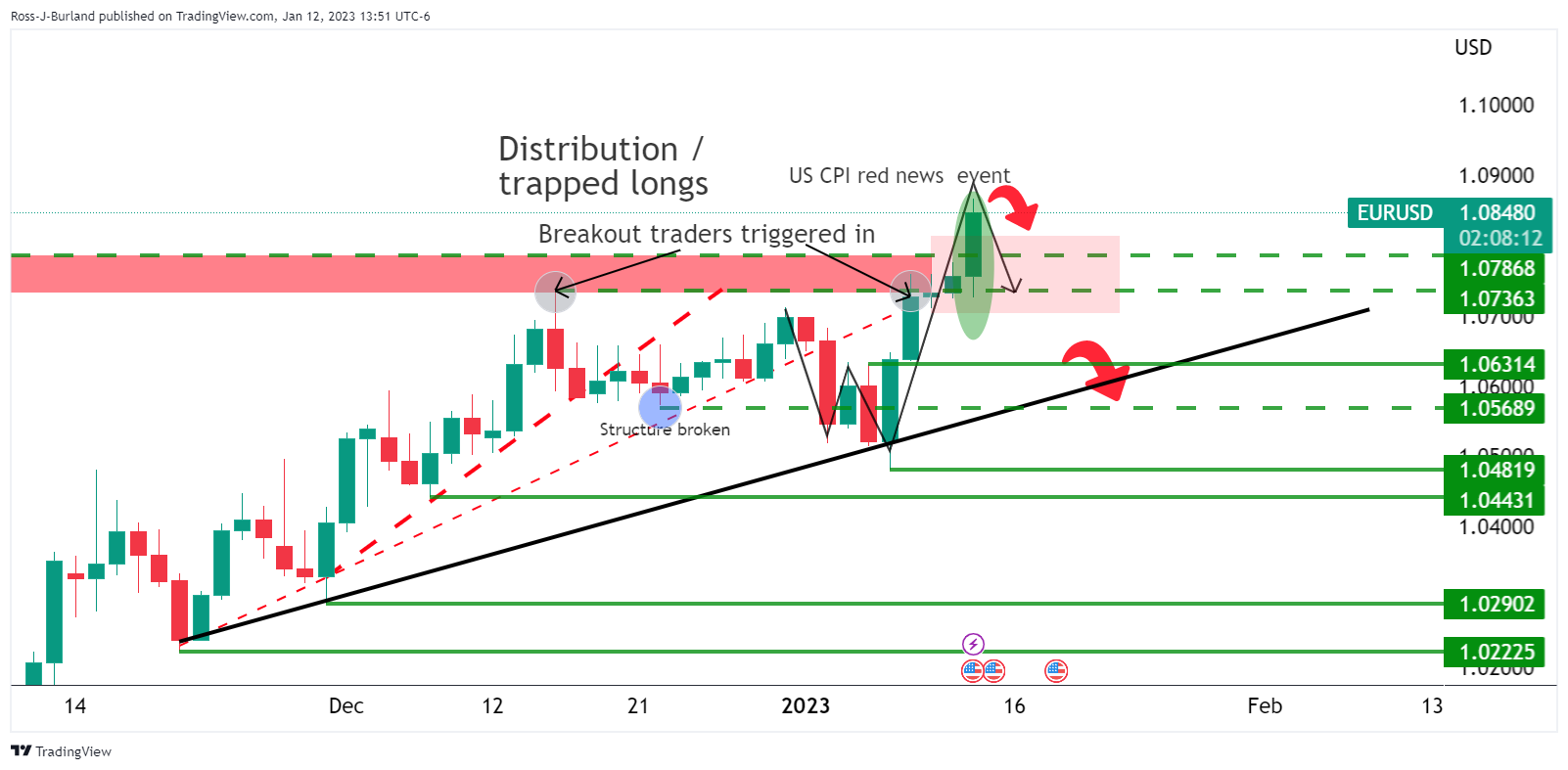按照前期分析,欧元/美元价格分析:多头可能会进入陷阱,有人解释说,押注突破的交易者在消费者价格指数事件之前得到触发,介入市场。然而,美国通胀引发欧元/美元反弹突破1.0800,并可能在1.0850区间内触发止损位。继美国通胀公布后的技术分析,这為后市欧元/美元反转打𫔭空间,欧元/美元刷新看涨周期高点,有望展𫔭為期5天的反弹。