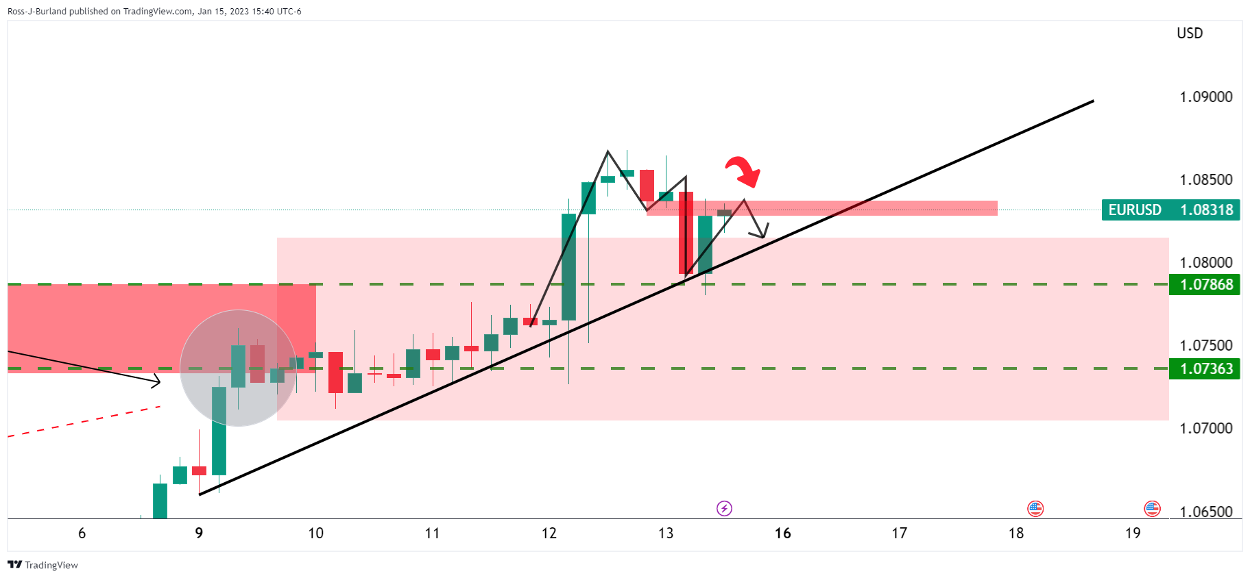 此后,欧元/美元格停滞不前,有望再次测试1.0780,并下跌接近1.0700。然而,空头需要欧元/美元在小级别周期跌破趋势缐支撑,例如以下4小时图所示: